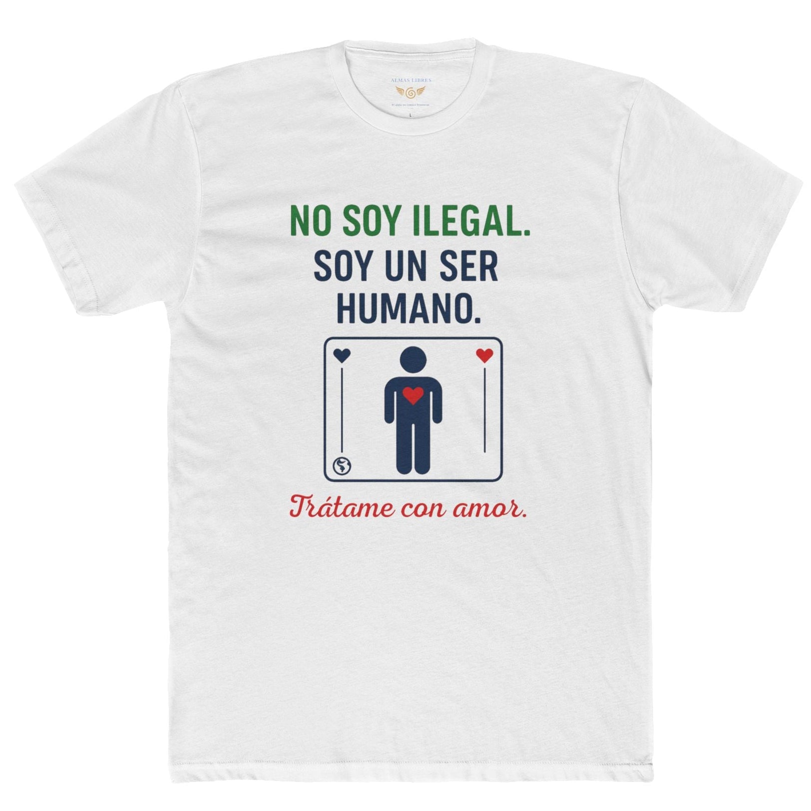Esta camiseta de algodón unisex no es solo una prenda: es una declaración de dignidad, humanidad y amor. Con el poderoso mensaje “No soy ilegal. Soy un ser humano. Trátame con amor.”, esta pieza honra las historias de quienes cruzan fronteras físicas y emocionales buscando un lugar donde ser vistos con compasión.